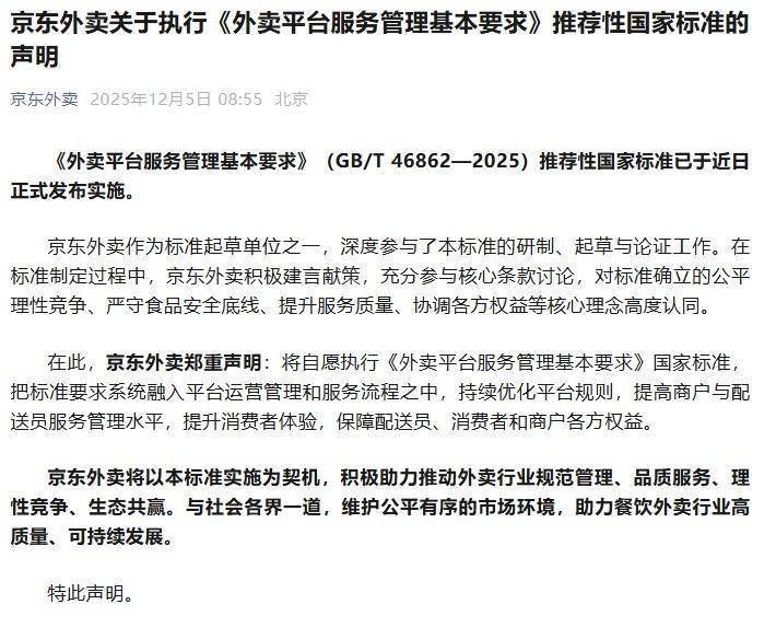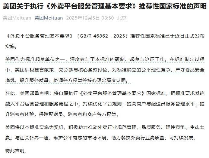 12月4日,美团、京东外卖、淘宝闪购相继发声,表示将自愿执行《外卖平台服务管理基本要求》国家标准,把标准要求系统融入平台运营管理和服务流程之中,持续优化平台规则,提高商户与配送员服务管理水平,提升消费者体验,保障配送员、消费者和商户各方权益。