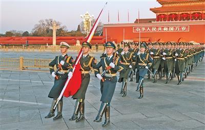 图为国旗护卫队迈着整齐的步伐走向升旗台。